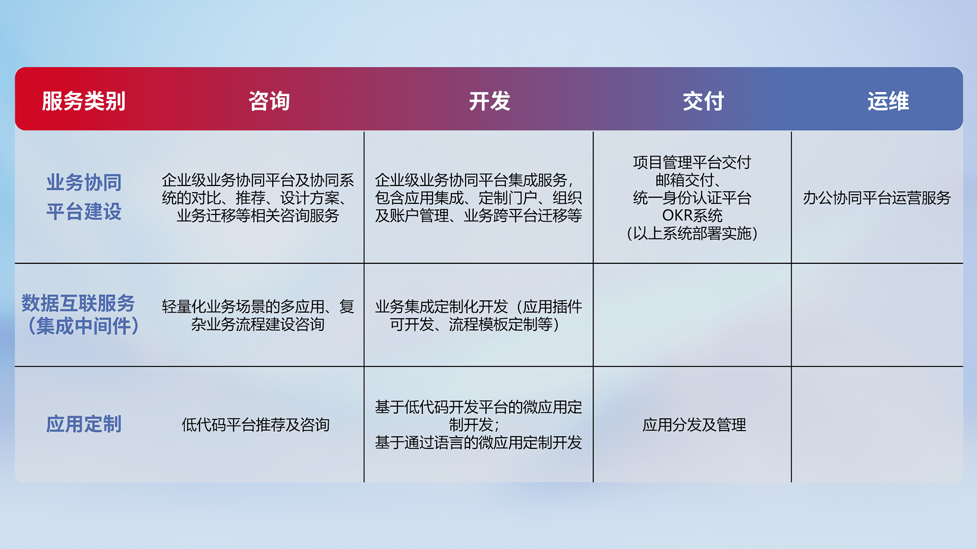 针对钉钉、、、、企微、、IDaas等平台级产品提供产品的规划、、、方案、、、交付、、定制化开发等服务,,实现如统一协同办公、、智能客户服务、、混合会议管理、、、、智能数据查询、、等业务场景,,实现数字化转型。。