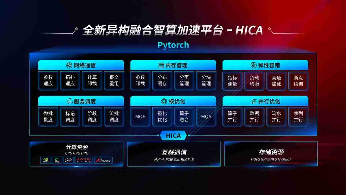 通过自研的服务层、、中间适配层、、以及调度编排算法,,,,采用数据并行、、模型并行等多种并行方式,,,,把并行计算任务进行有效的分解,,,,使其分别由相应的软件栈和算力资源来承接。。。。当GPU资源变化,,,HICA可以实时动态调度计算子任务并调整模型拓扑和架构,,,,以充分聚合各种算力资源。。。
