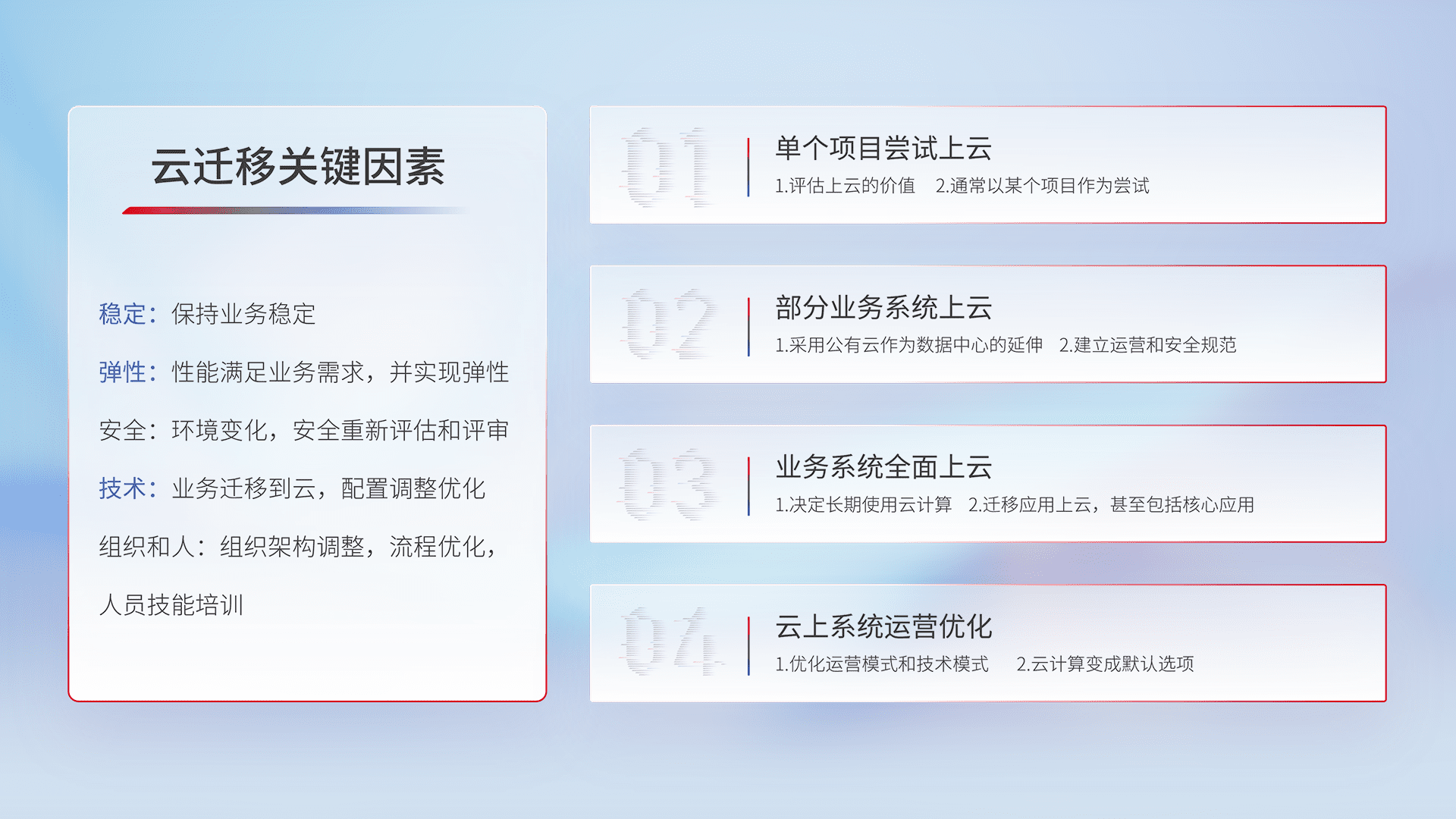 结合实际业务,,,,从规划设计、、、、云平台选型、、、云原生改造、、数据迁移、、、集成交付,,迁移全过程为客户识别最佳上云路径,,做好风险识别管理,,,,设计网络架构、、身份权限、、、、安全审计合规、、、、操作审计、、、日志审计、、监控告警策略、、多站点容灾设计等,,,对云上基础设施进行整体规划,,,提升IT治理水平,,,以满足弹性、、、、高可用、、高性能的需求。。。。